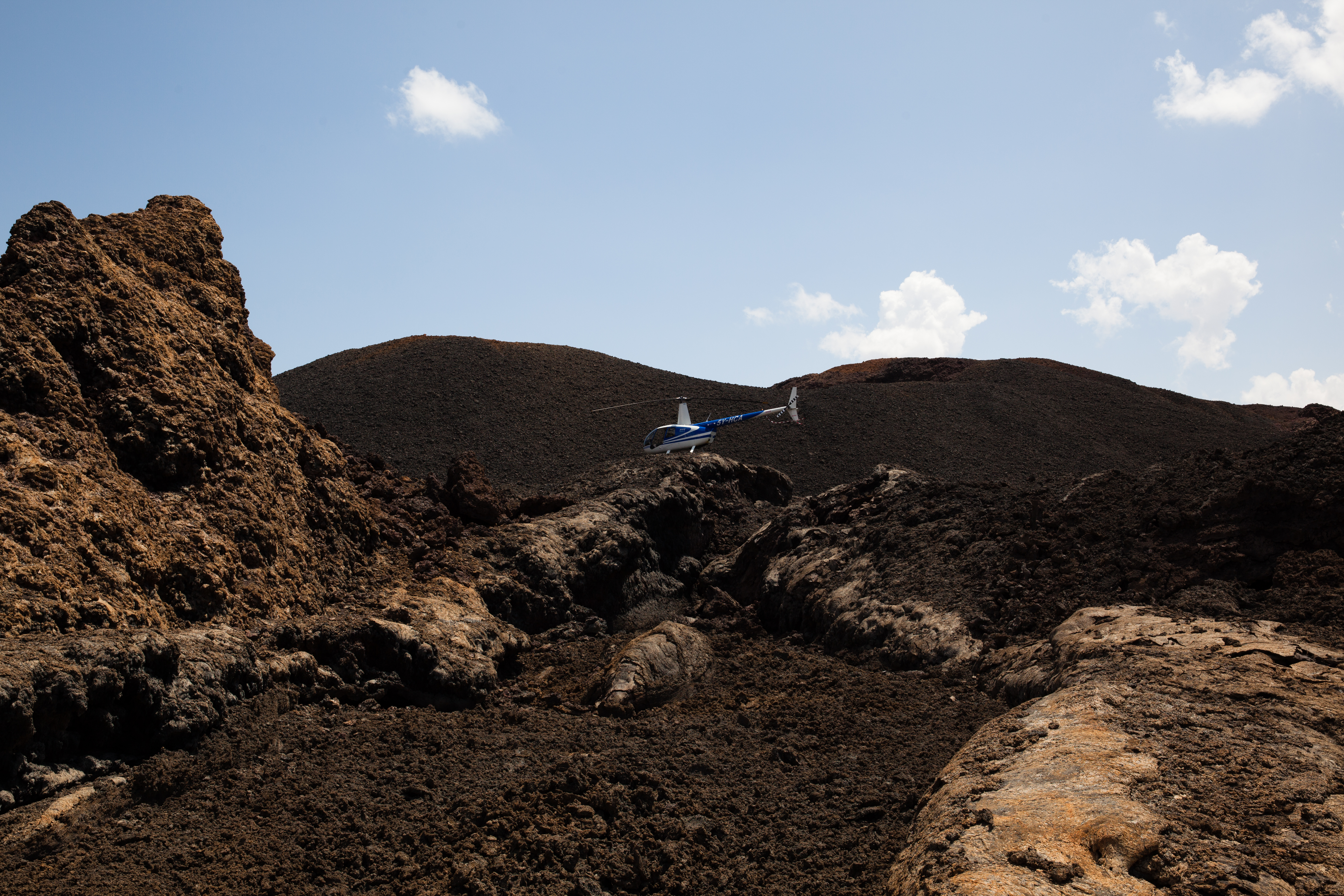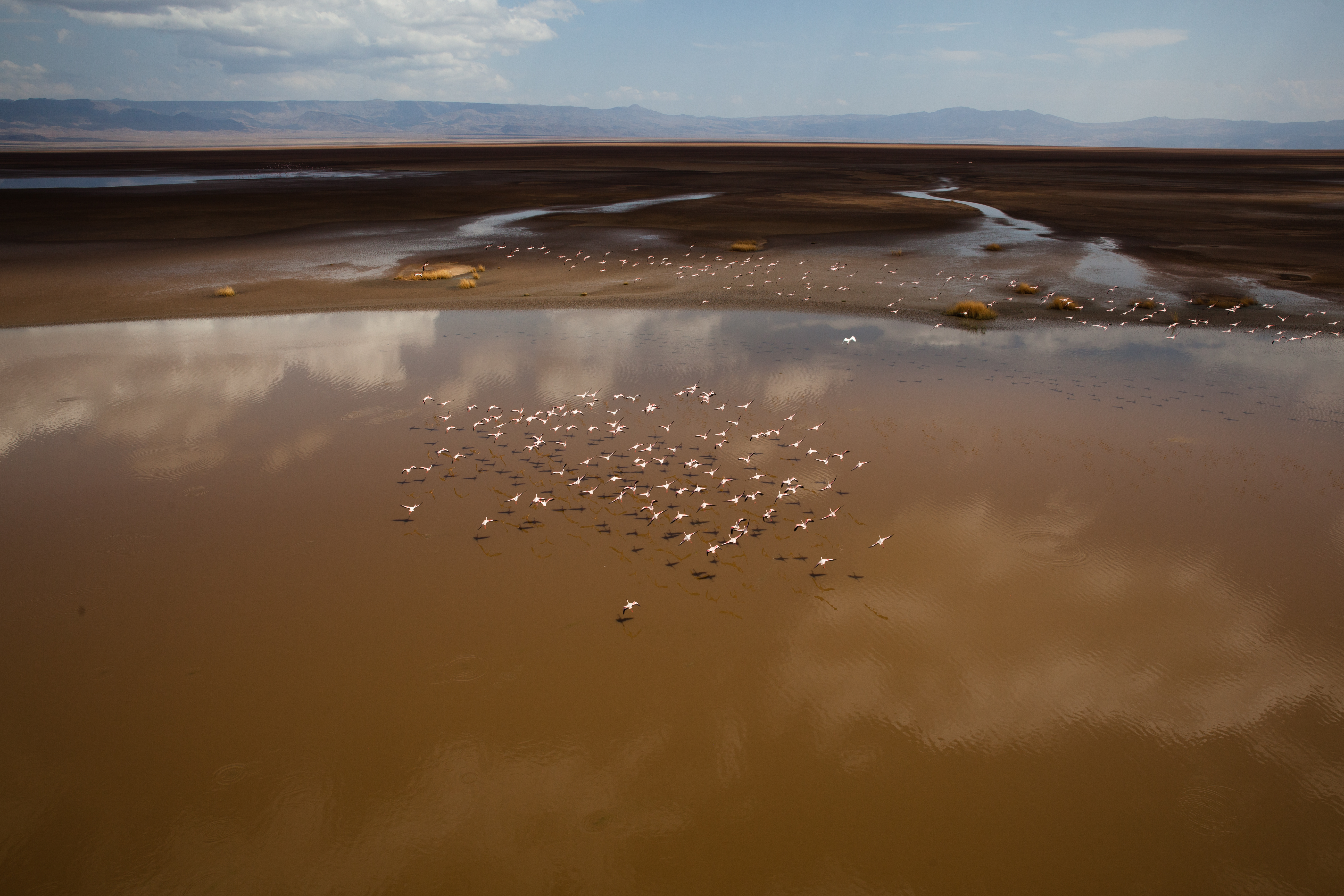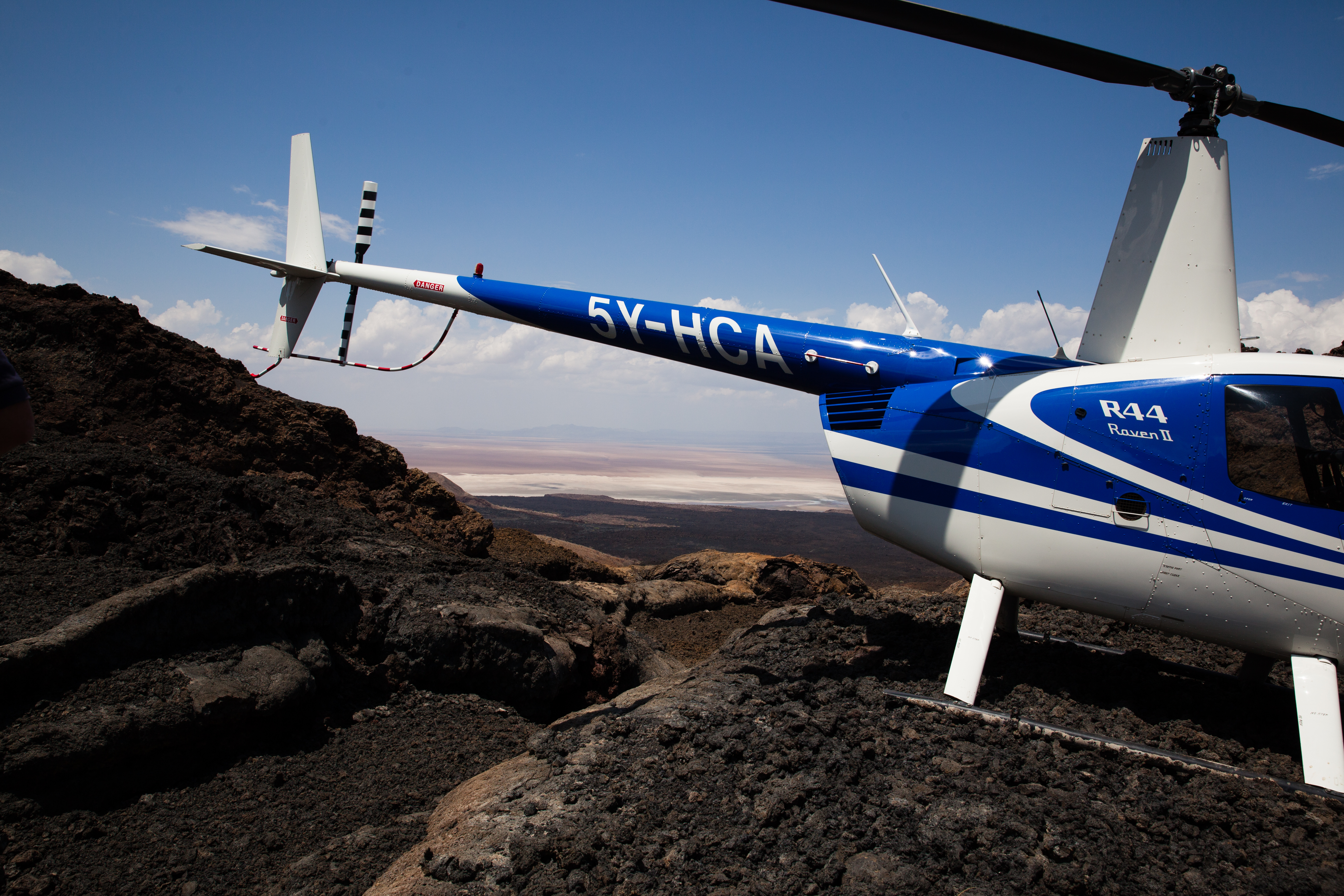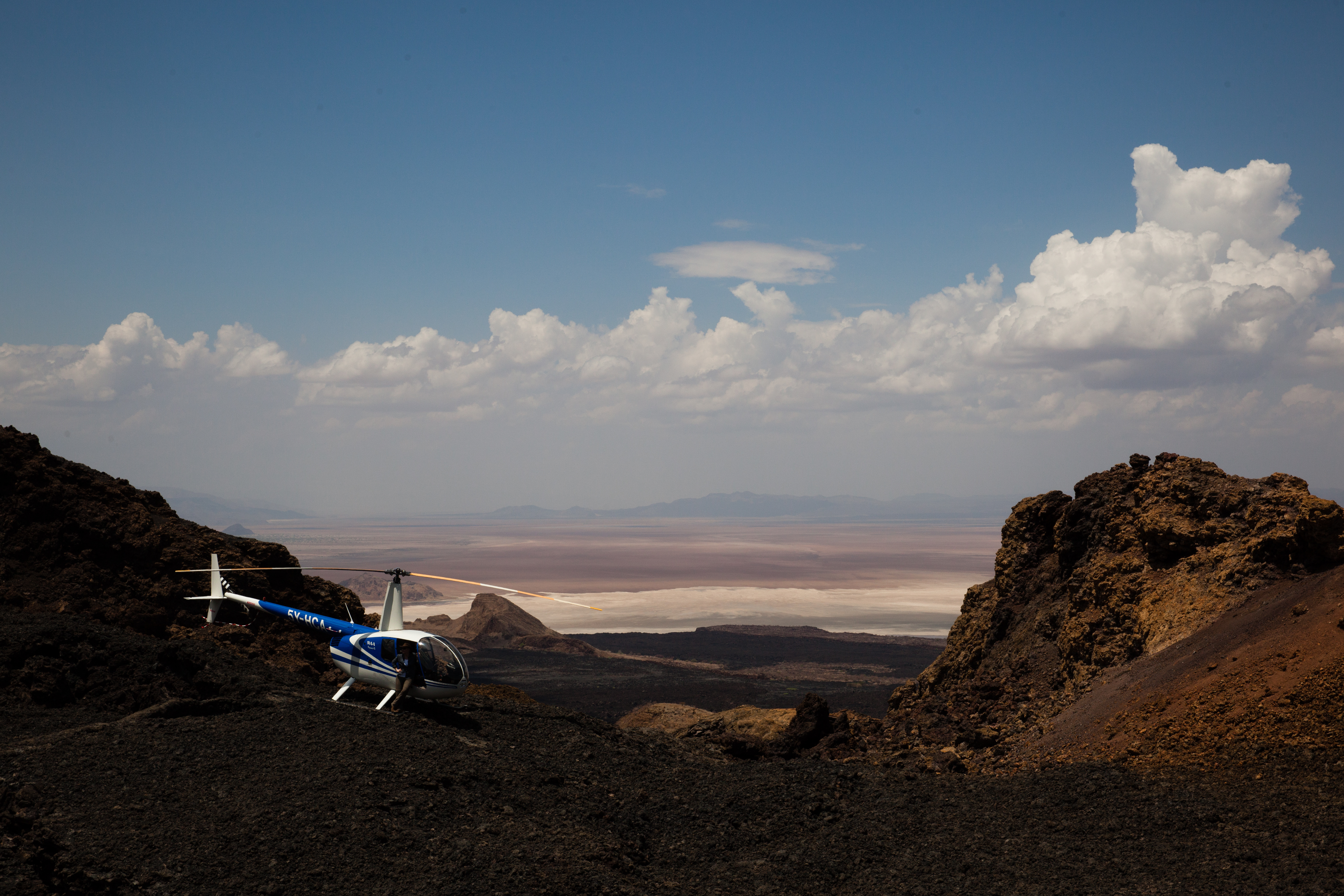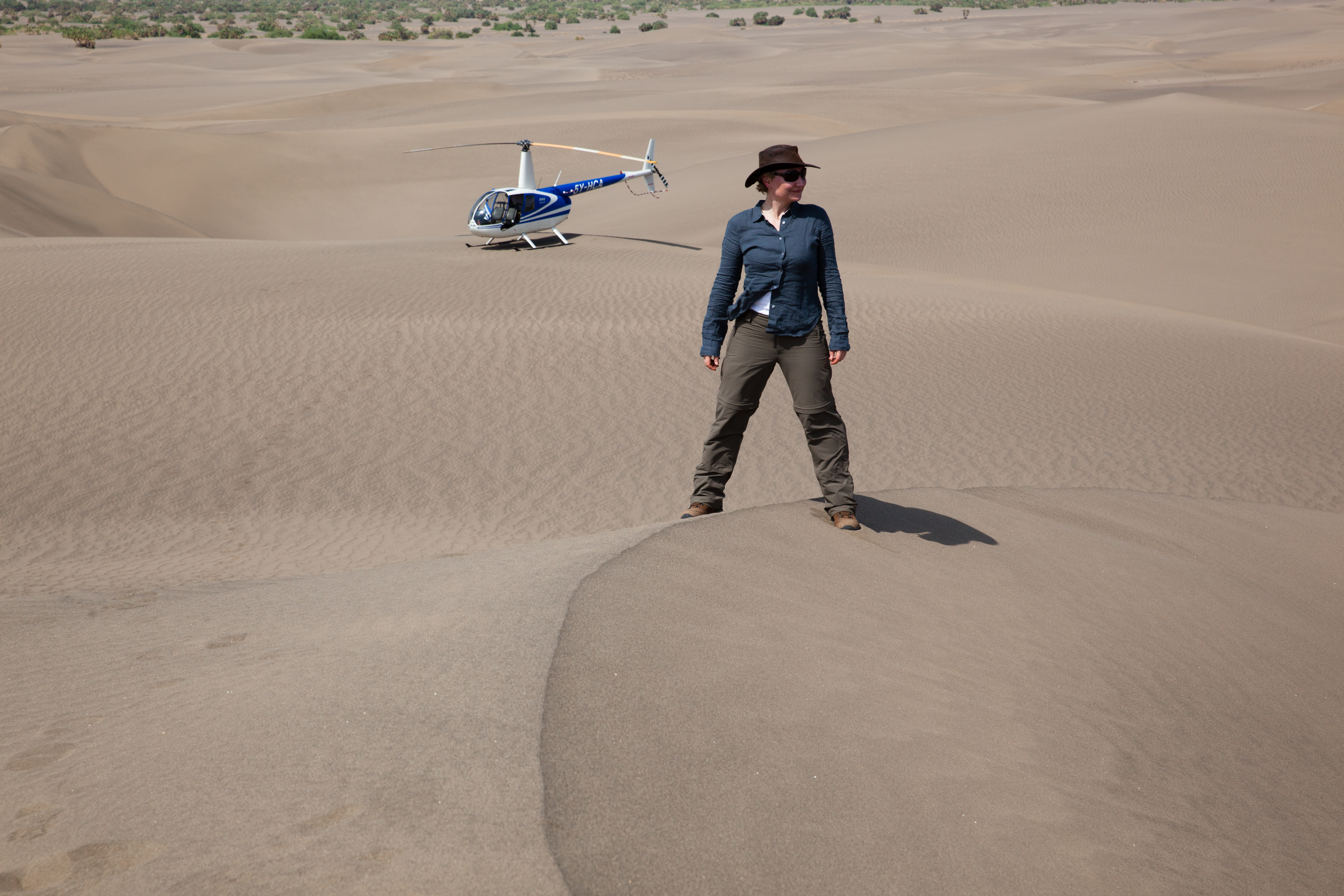 And the day continued like that, landing on sand dunes, running down them and doing sand angels at the bottom (and walking back up the bloody thing), setting down on volcano crater edges (two landing attempts “Ina, can you just check whether the back of the skids are over the edge?”), where no white people would have walked before us because there is no way of getting there and no reason to be there. No water, no food, no shelter. Following crocodiles up estuaries, and seeing millions of flamingos fly. It was like living in a National Geographic magazine. And Andrew caught a baby crocodile. I told you he was nuts. He put it back. He’s a nice guy. He is also an outstanding pilot.